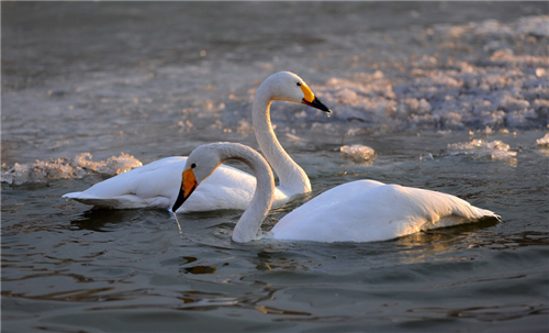 體型特征:大天鵝全身的羽毛均為雪白的顏色,雌雄同色,雌略較雄小,全身潔白,僅頭稍沾棕黃色。虹膜暗褐色,嘴黑色,上嘴基部黃色,此黃斑沿兩側(cè)向前延伸至鼻孔之下,形成一喇叭形。嘴端黑色。跗蹠、蹼、爪亦為黑色。幼鳥全身灰褐色,頭和頸部較暗,下體、尾和飛羽較淡,嘴基部粉紅色,嘴端黑色。