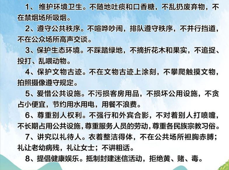 近年來隨著我國經(jīng)濟社會的發(fā)展和人民生活水平的提高,越來越多的人加入到旅游者的隊伍中。通過旅游,一方面可以飽覽祖國大好河山,擁抱美麗大自然,另一方面開闊視野、增長知識,享受美好生活。當(dāng)然在享受美景的同時,還須注意自己的言行舉止,旅游是社會文明的窗口,尤其在出境游中,中國游客不僅代表的是個人形象,更代表國家形象。所以,要文明走天下,做文明旅游者。在此我們向廣大游客發(fā)出倡議: