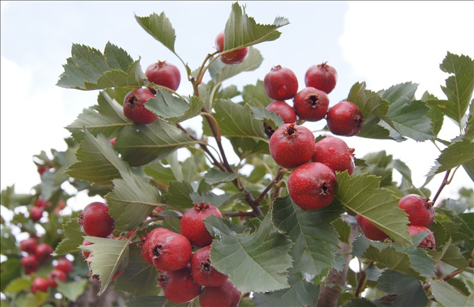 山楂樹為落葉喬木,葉子近于卵形,有羽狀深裂,花白色。果實球形,深紅色,有小斑點,味酸,可以吃,也可入藥。其本適應性強,即是在山嶺薄地,生長發(fā)育也比其他果樹為好。